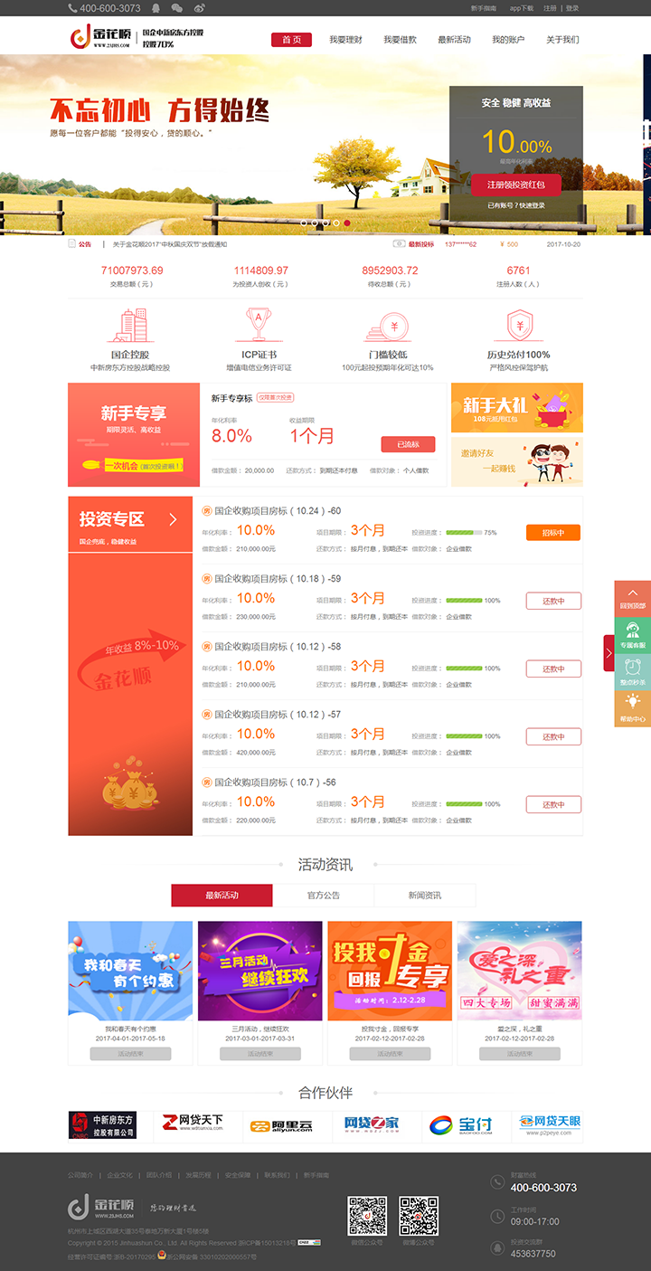浙江桓隆投资管理有限公司旗下金花顺(http://www.23jhs.com),由国企中新房东方控股管理有限公司直接控股,主要致力于解决用户的投资理财需求,提供车贷、房贷、基金业务咨询等专业金融投资服务,立志于做真诚服务广大用户的正规合法P2P网络安全借贷平台,于2015年10月正式上线,由浙江桓隆投资管理有限公司开发运营。