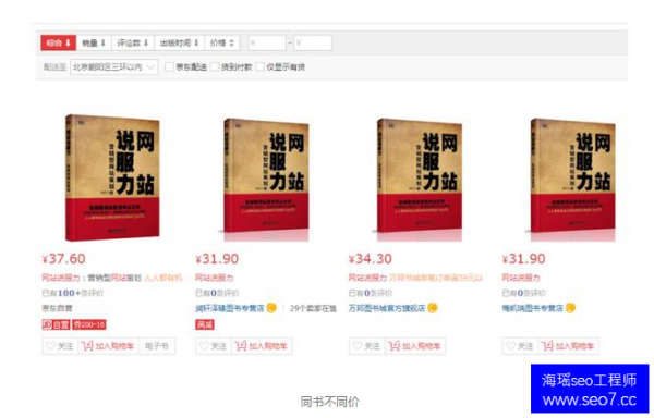 这是京东商城上一本书的截图,我们会看到这本书的价格不一样,分别是37.6元、31.9元、34.3元,37.6元。37.6元是最贵的,却卖得最好,其他的评价是0,37.6元那个是100+。分析原因,发现37.6元的是京东自营的,这时用户更多在乎的是自营这种快递带来的高效、便捷性,所以不再去关注几块钱的差额。
