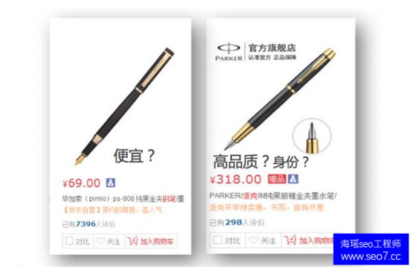 比如有支钢笔的标价69元,另外一支标价318元。有些人不一定认为69元是便宜的,因为他曾经买过十块钱的钢笔;以前没用过十块钱钢笔的人会认为69元很便宜;有些人觉得318元是身份的象征;也有人觉得几千块或几万块的钢笔才是身份、高品质的象征。