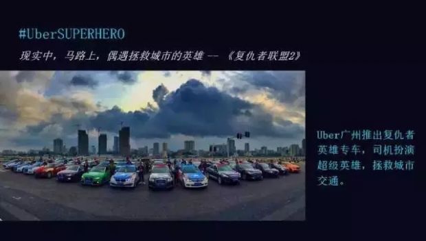 每年的九月份是面试的高峰时间,当时我们在广州大学城做Uber的面试,我们尝试换个角度去思考问题。比如从交通出行角度来讲,我们选择把这样一个便利性的东西变成一个时尚的东西,这些都是非常简单的。五月份我们做了一个《复仇者联盟》的活动,我们找了50台车,全部装扮成复联的成员。