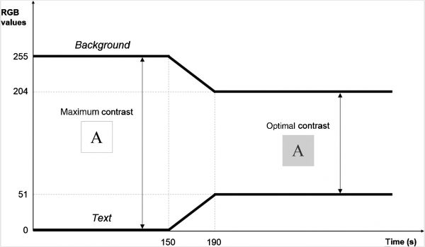 Adaptive luminance contrast: gradual decrease between text and background as time passes.