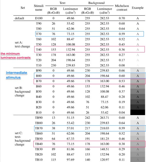 与早期的研究结果相反,当文本和背景之间的亮度对比度最大时,阅读速度最快。