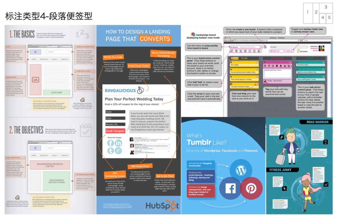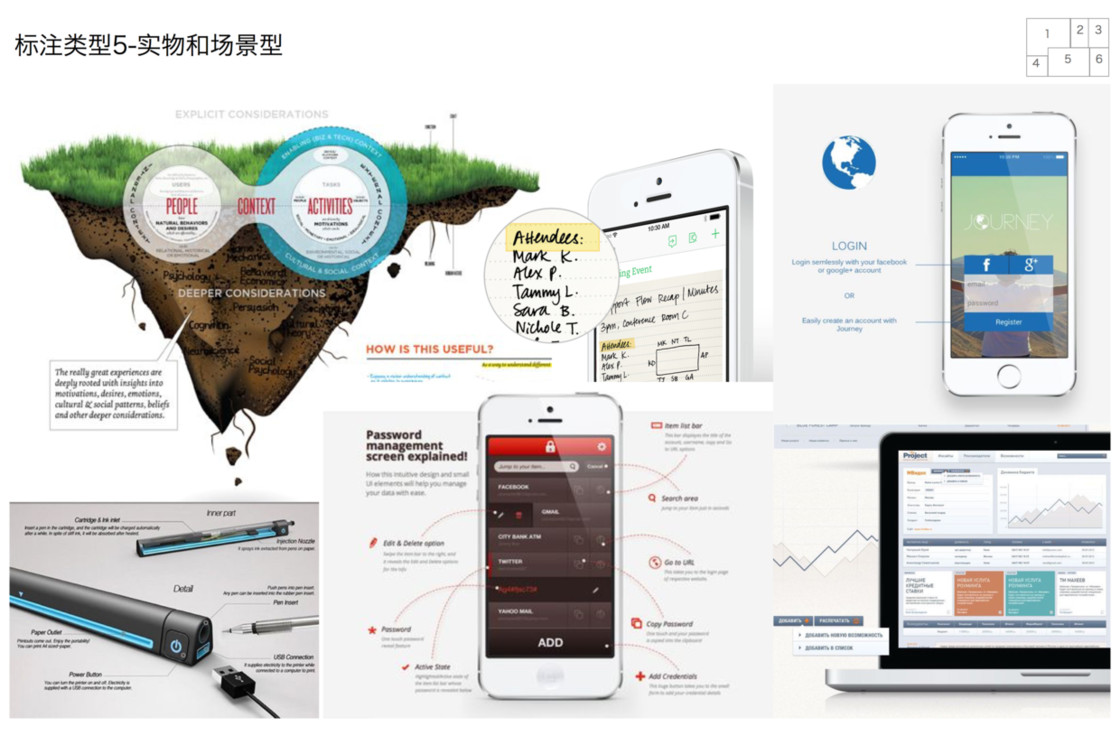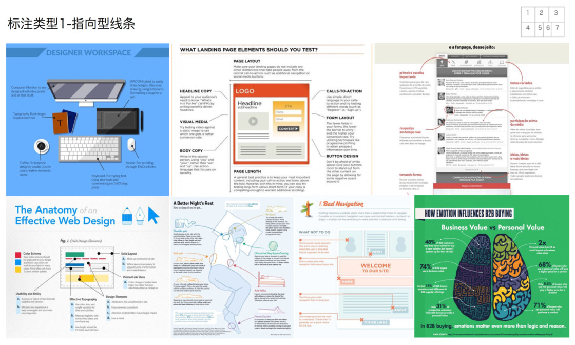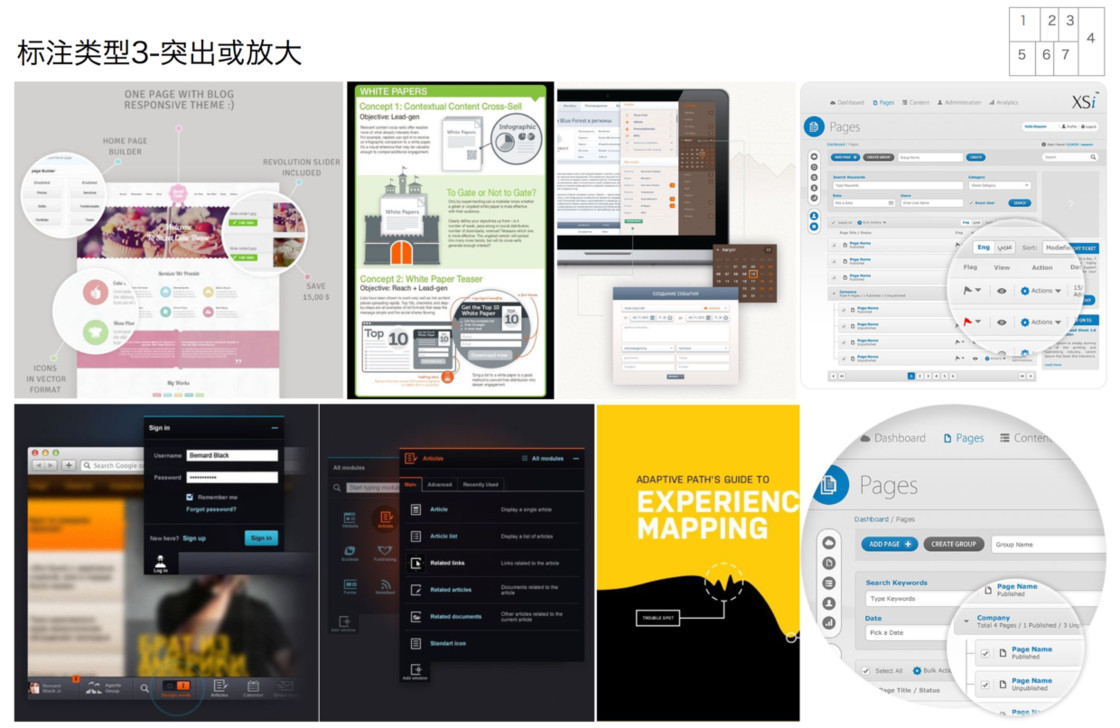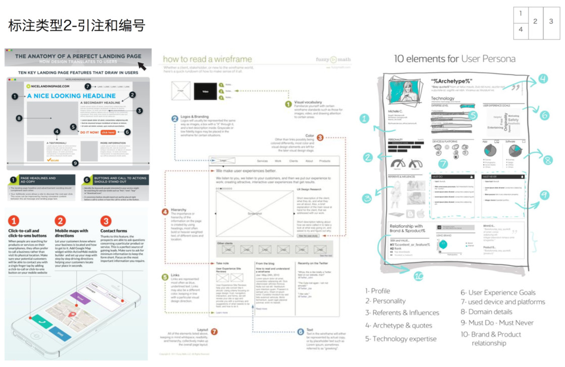 从范例中学习借鉴图示标注是一个比较有效的方式,结合不同的场景和需求,这里将标注分为五种基本模式来介绍:指向线条、编号、便签、突出和放大、场景。