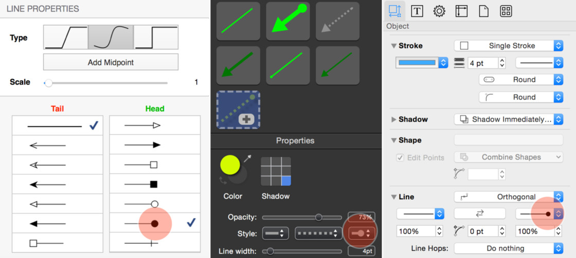 OmniGraffle 中绘制连接线的优势在于各种线型的线条会随对象的移动自动延展,这一点上截图软件里是做不到的。OmniGraffle 中和线条绘制有关的几个关键点有:线条的端点形状(Object-Line)、对象的磁极点(Properties-Connections-Other objects)。