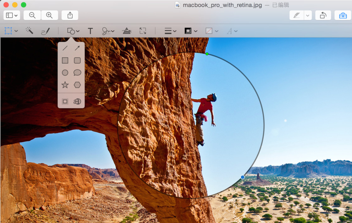 Snagit 中要表现放大效果只需要用圆圈套索选中后复制粘贴并调整粘贴图片的大小即可,不过这种方式没办法设置放大部分的边框和阴影,比较简陋。「预览」程序中有专门的放大效果设置,由工具栏选择放大镜,绿点调节放大倍率,蓝点调节放大区域。