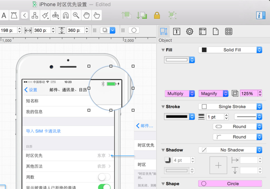 OmniGraffle 中设置放大效果最灵活,有更多可供调节的参数。具体步骤:首先绘制一个圆形,然后设置圆形的图层叠加特性(Object-Fill-Multiply)为透明,选择填充的效果(Object-Fill-Magnify)为放大,最后设置放大倍率即可。圆形形状可以随意的移动位置、设置外框线条的大小、颜色甚至阴影(Object-Shadow)。