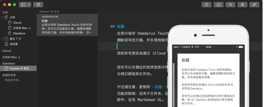 因为加壳后获得的 PNG 图片背景是透明的,所以借助 Snagit、OmniGraffle 自己也可以拼合出一些更符合自己要求的场景图示结果。例如下面的这张 Ulysses 和 Daedalus 同步的截图,首先是在手机里截取的 Daedalus 软件界面,然后传到 Mac 上用 Promotee 导出成有 iPhone 6外壳的图片,最后在 Snagit 中插入到另一张桌面软件截图中,调整了一下输出的图片高度,导出成最终的样子。