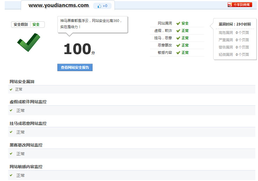 《友点企业网站管理系统》经过研发团队不停地完善,成功通过360网站安全在线检测,没有发现任何漏洞,得满分100。请大家放心使用。